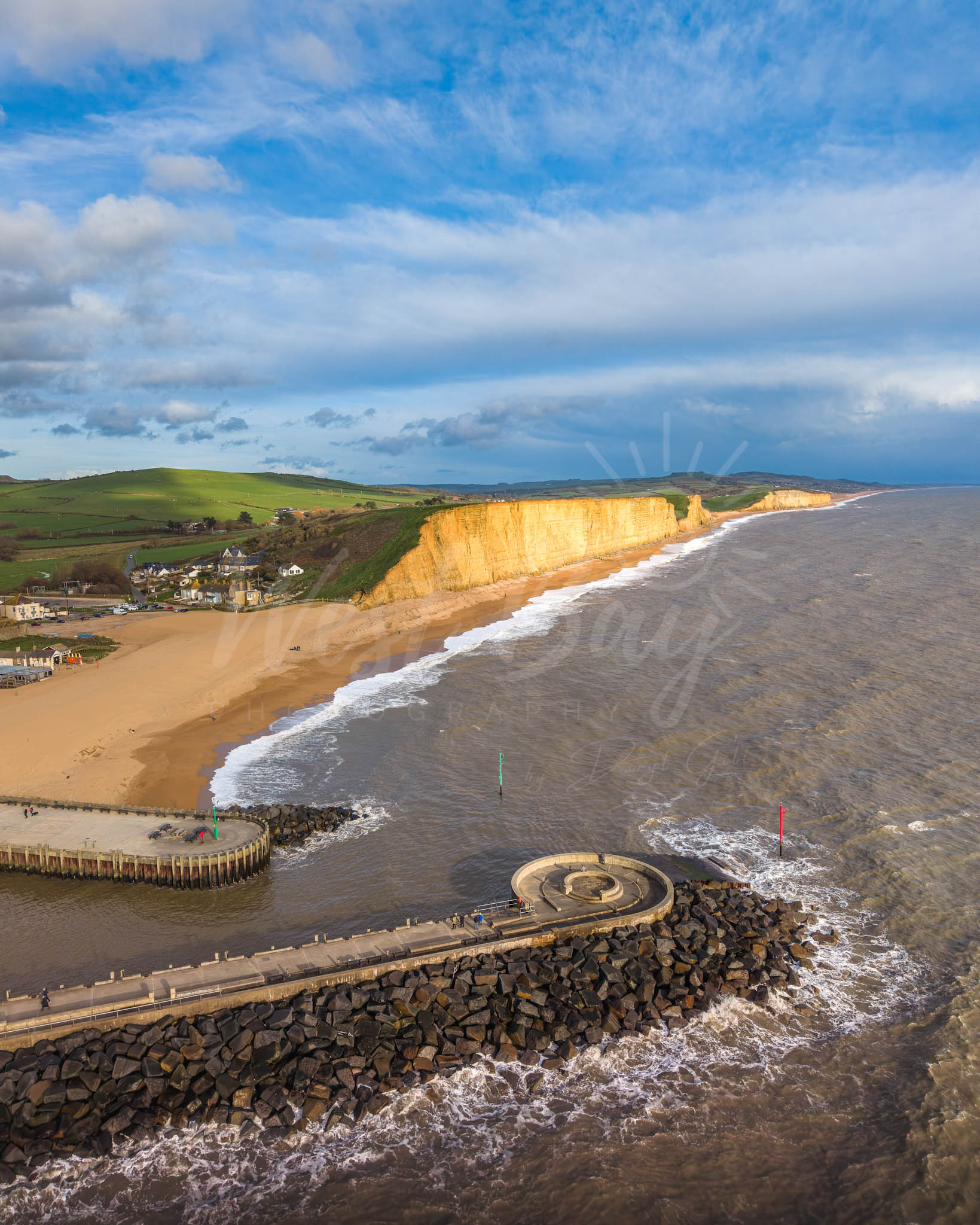 Photographed on the Jurassic Coast in West Bay, Dorset, this image captures the dramatic golden cliffs and Jurassic Pier stretching out into the sea.